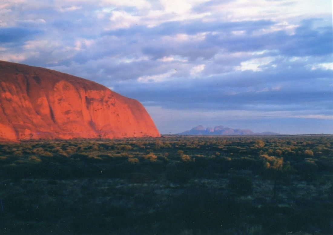 Ayers Rock at sunset with Olgas (c) Marie Trudinger circa 1955